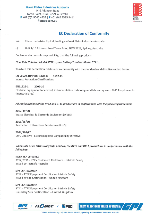 EC DECLARATION OF CONFORMITY RT12 BT11 2016
